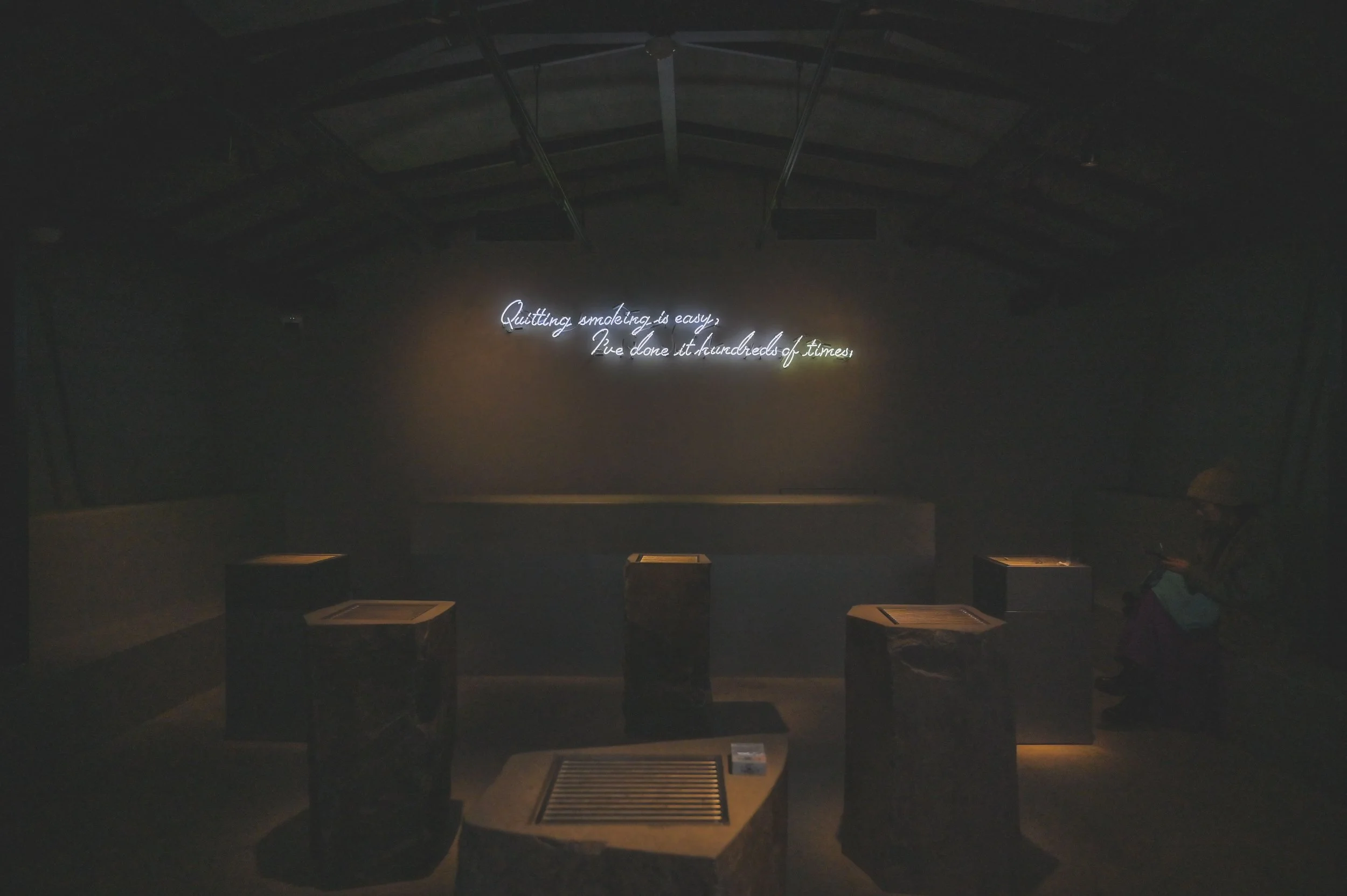他們同時經營吸煙場所品牌@the_tobacco,在東京、橫濱等地有十幾間店舖。嵌入在有樂町高架橋下的「THE TOBACCO 2:50.76」以一支菸的平均時間來命名,當然時長因人而異,重點是標記下這努力生活、微小但重要的時間。混凝土基底架空出來的異空間,本小松石配搭植栽與鐵件,告別吸煙室充滿壓迫感且空氣對流差的既定印象。除了空間,最棒的是音樂,現場播放歌單也有在Spotify上,是由黑膠資訊平台@recoya_精選的Playlist,種種Program像是牆上霓虹燈的字樣「Quitting smoking is easy, I've done it a thousand times」重新對吸菸議題留下耐人尋味的探問。