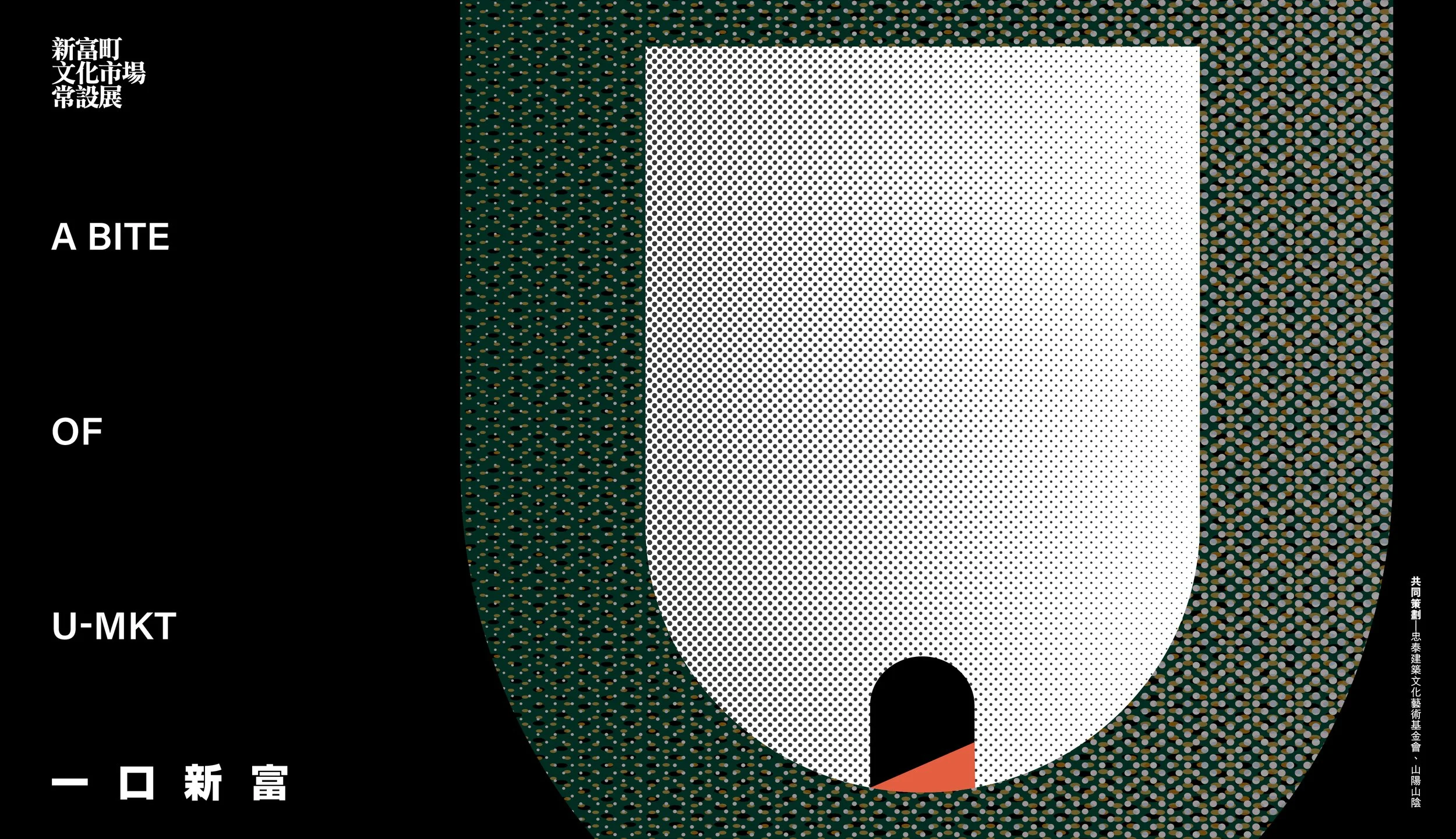 U型作為新富町文化市場最主要的記憶點與連結點,常設展主視覺在策略上延續既有的「U」型語彙,結合「口」字意涵,將U型轉譯為可填充的載體,同時也象徵著U-mkt本身作為空間容器,創造內外連結與新舊對話。延續一口新富中宏觀、微觀的概念,將口的尺度持續ZOOM IN遞進、口包著口,象徵從鳥瞰城市到走入市場,並融入三個分區顏色,並呼應整體空間策略,不以圖面、色塊為主,而是運用不同的質地、質感代入。以U型容器作為主體的視覺設定,亦可創造後續在社群宣傳上的運用彈性。