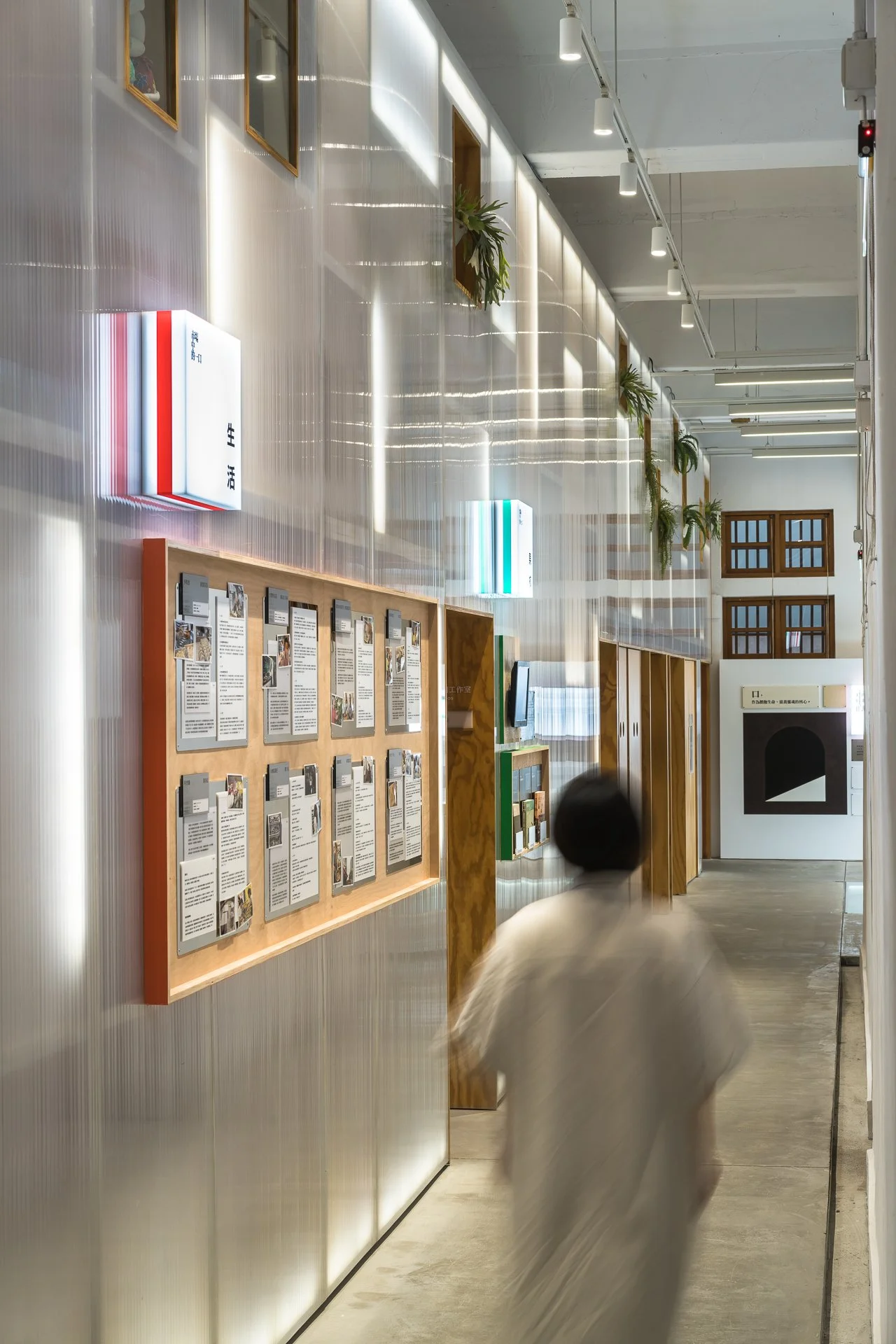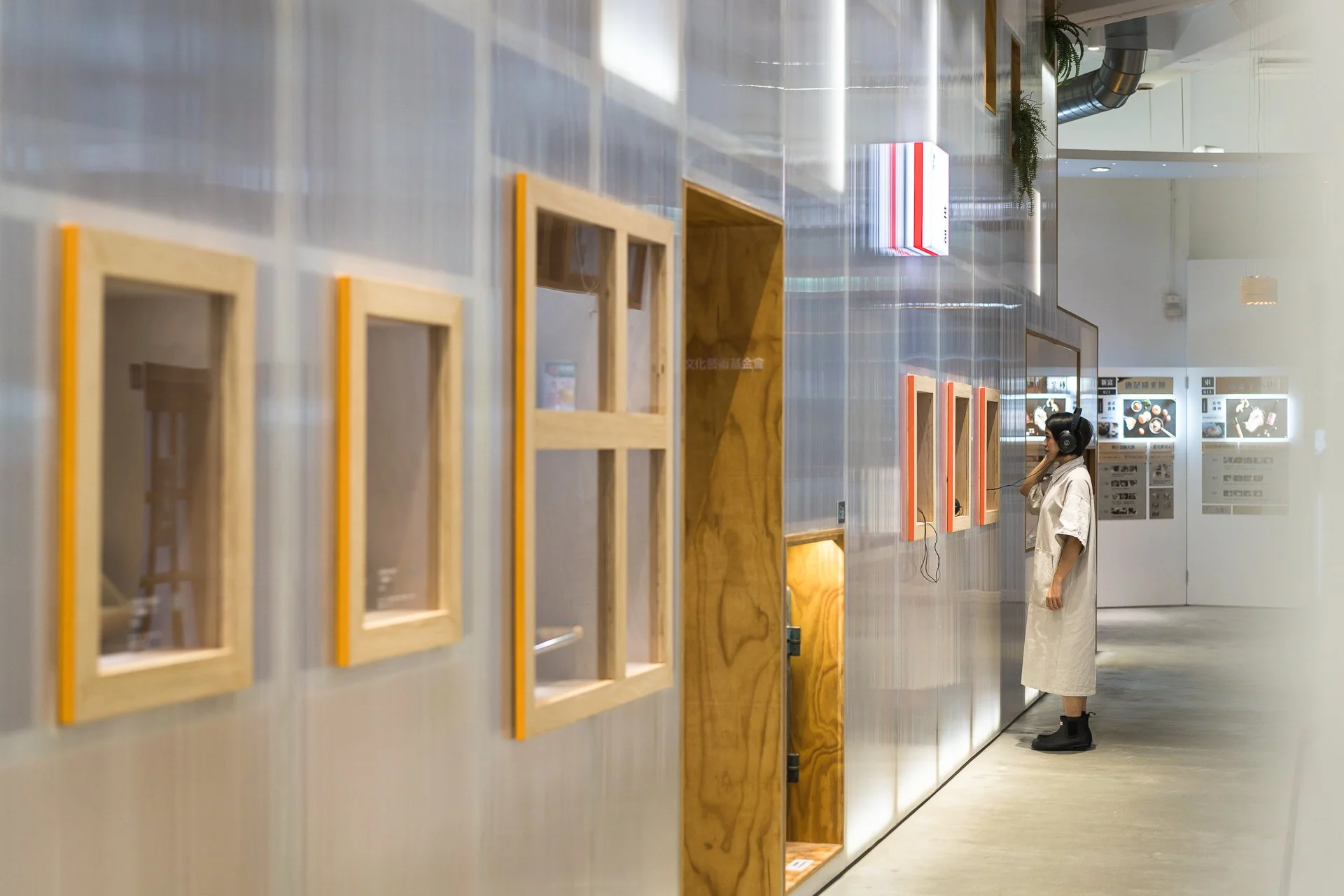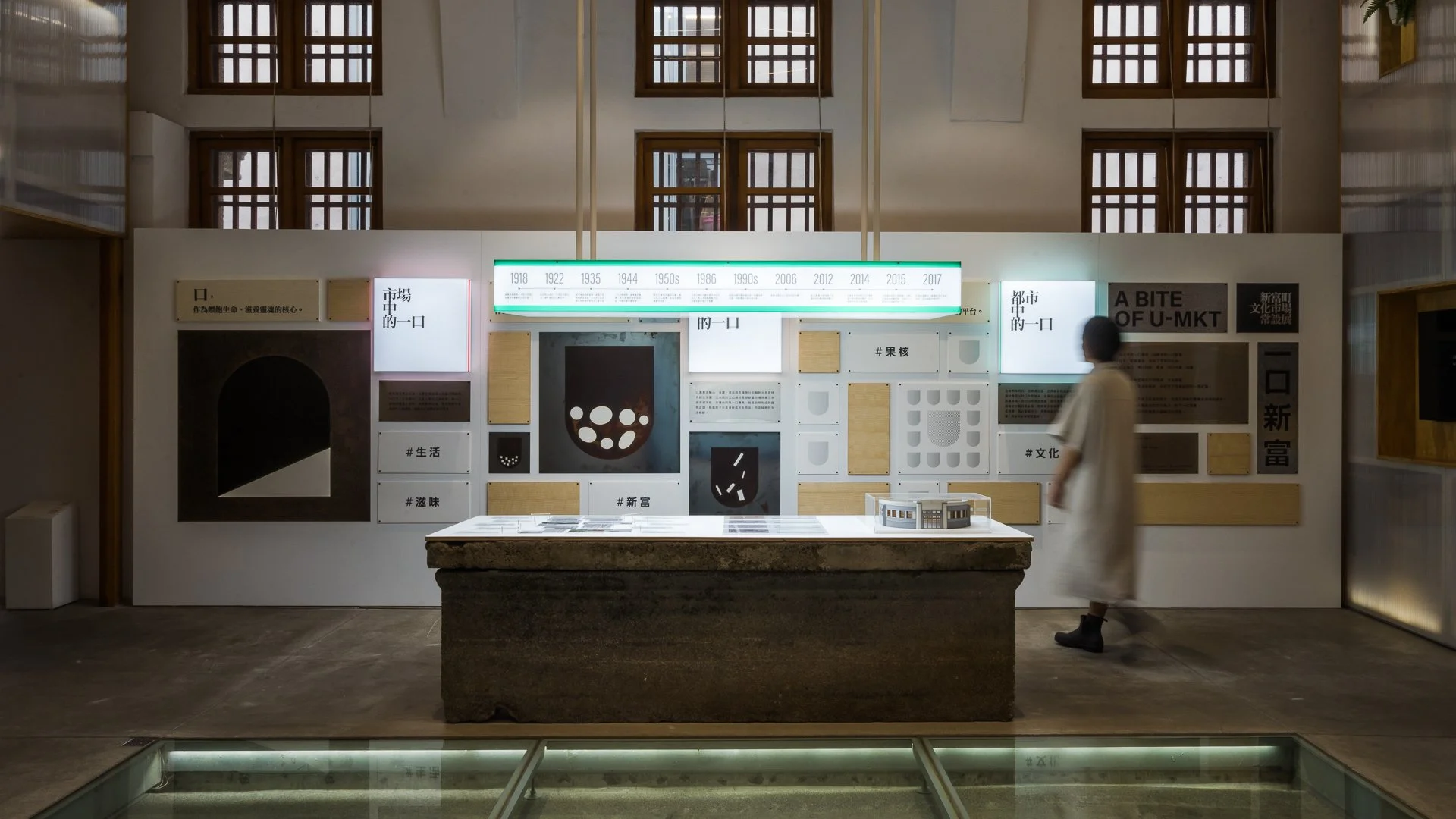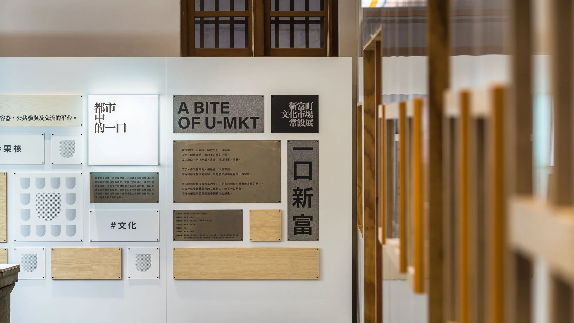 由於定位為常設展,有別於前陣子甫落幕的特展,必須將未來的可能性,如特展空間、臨時性活動空間等囊括進空間策略思考內,既要能讓常設展有完整的觀展經驗,但也同時要能保有場域原有的彈性。整體扣連策展主題「一口」的核心精神,以輕巧的形式手法讓常設展展示更加貼合於原空間,並將內容資訊輕量化,運用網站進行擴充。山陽山陰觀察到新富町文化市場空間本身花旗松夾板所展現出的木質調與塑楞板的半透明,材料上選擇延續原場域的調性,並進一步創造對話,在既有厚牆所預留的展示櫃,運用外嵌式的木作邊框,在創造新展示立面的同時,也能運用色彩進行主題分區界定,並穿插如同小招牌一般的燈箱元素,除了作為民眾動線導引,亦開展出不同的立面風景及趣味性。甚至也因應常設展相對綿長的展期,穿插運用鐵件材料,伴隨時間鏽蝕將會產生變化留下痕跡,創造另一層敘事。然而,面對原場域的U型展示廊道性質,其線性動線性質並不適宜配置大量需駐足閱讀之內容,藉由一口新富選品企劃巧妙將過道轉換成為嶄新的櫥窗風景。
