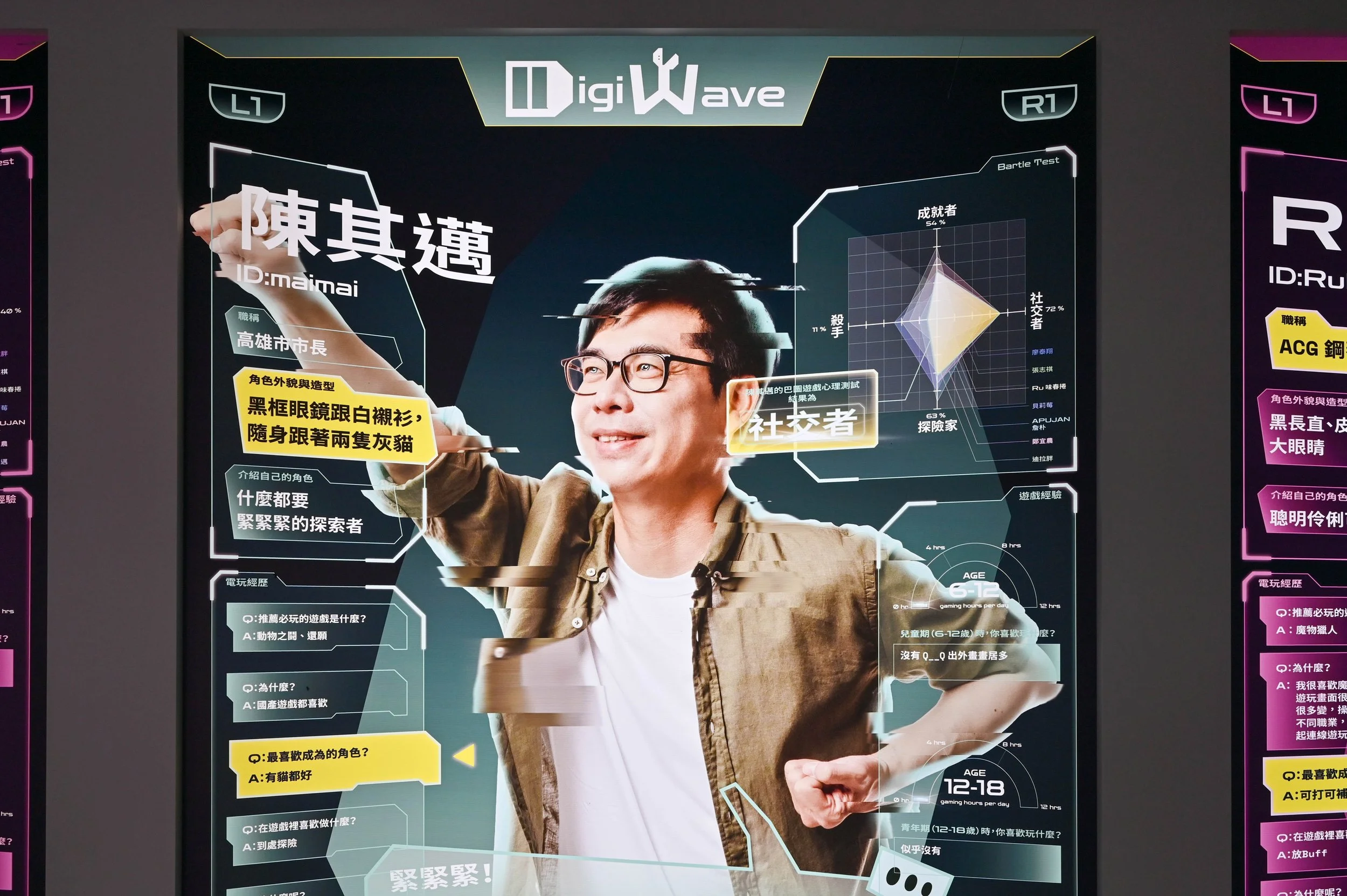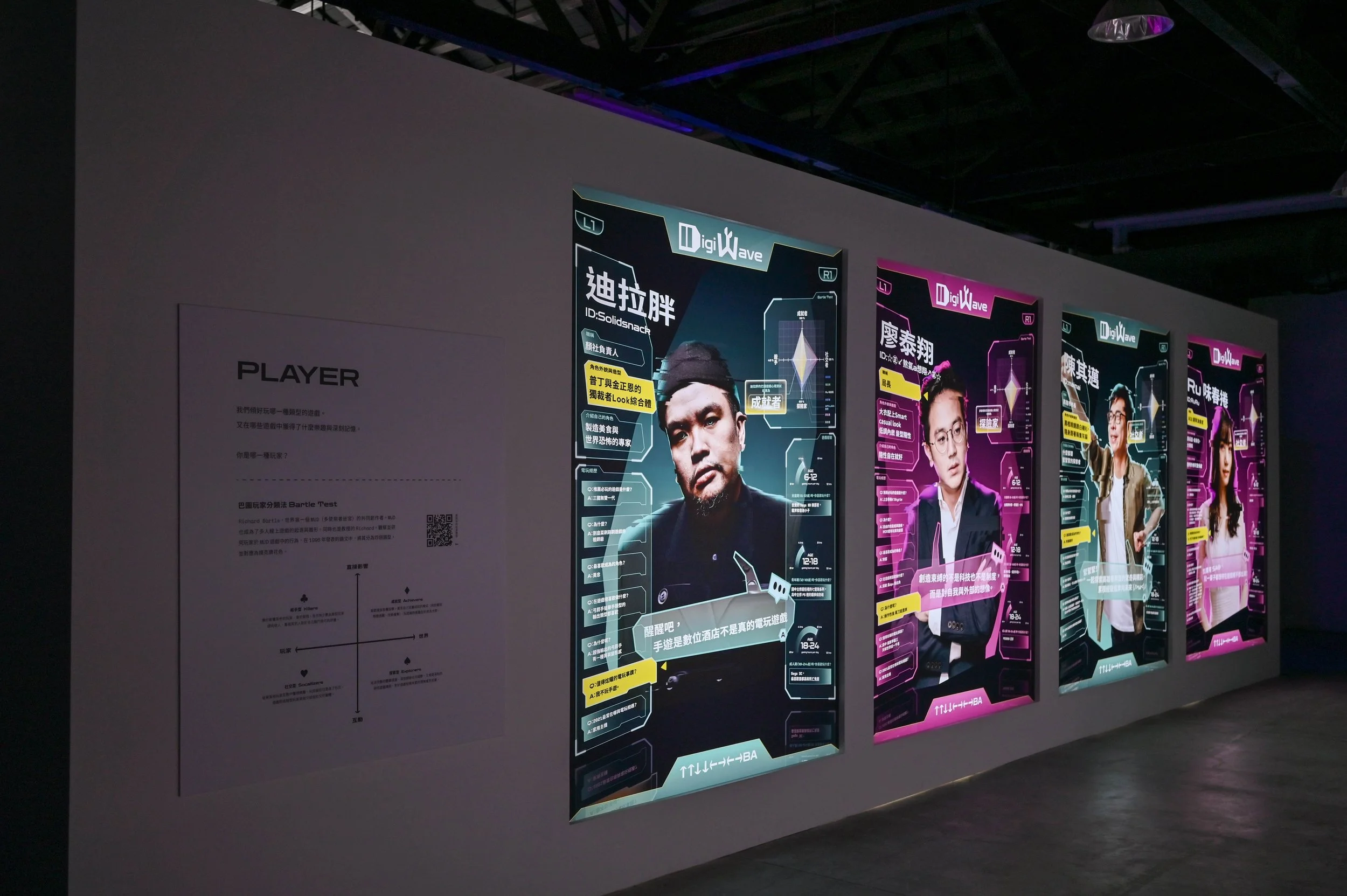 進入遊戲畫面後,許多時候會先與資訊(DATA)與角色選單(PLAYER)的視窗介面相遇,「PLAYER」展區將其嘗試轉譯於展場,以相對大幅的燈片呈現,藉由電玩介面中的語彙,如按鈕、選單等,企圖呈現玩電玩時游標上下滑動的狀態,可見部分選項因被選取而被highlight出來。展區內容展出八位名人與電玩間的關係,包含推薦電玩及喜愛成為的角色、在電玩上所花費的時間等。