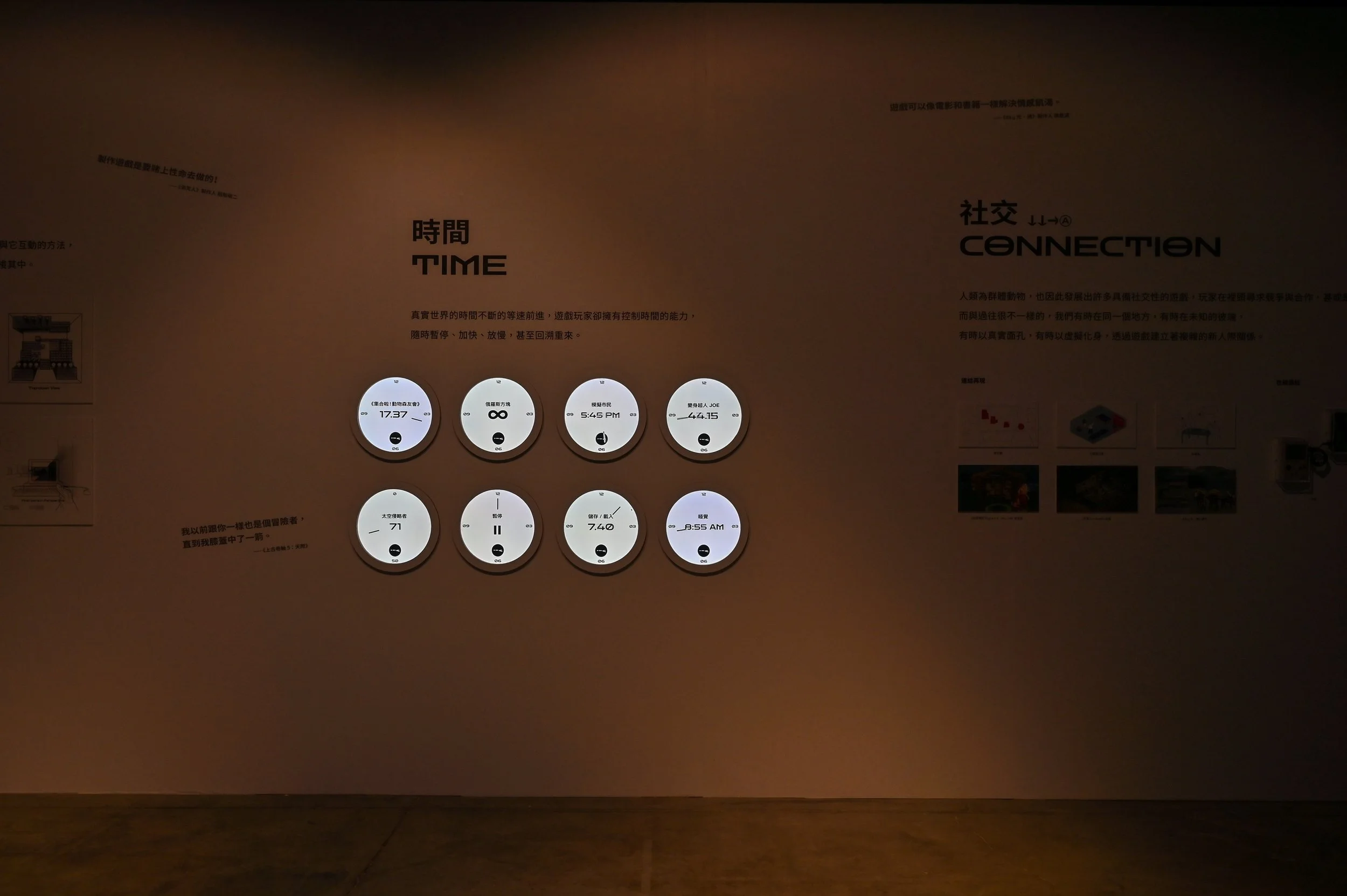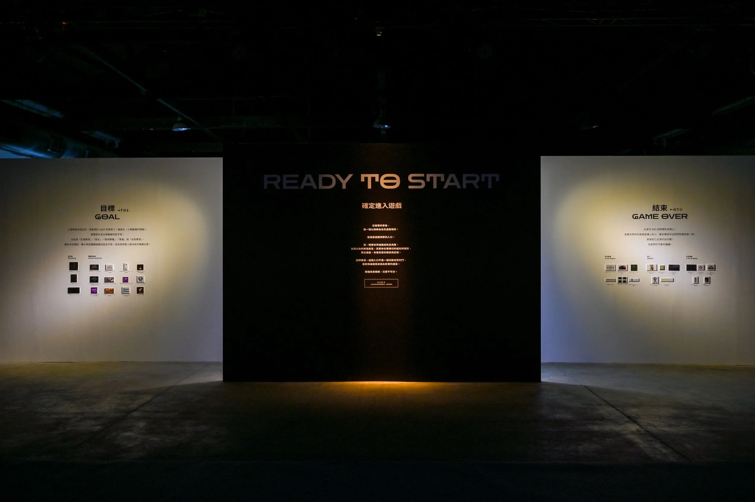「電玩遊戲(Video Games)作為一種同時結合視覺、聲音、互動和與敘事的藝術,讓使用者在全神貫注狀況下接受資訊。」其實展覽也是如此。此次展覽目的在於創造「虛擬電玩與真實生活的連結」,對應在空間策略上,我們認為「展覽本身就是一場遊戲」。如何在展場空間體驗中讓觀者在虛擬與真實中游移,鋪陳與控制進入遊戲前後的過渡氛圍與觀展節奏,叁式如何藉由互動設計、數位體驗將虛擬連結至真實經驗創造共感,分別是彼此在展覽中企圖達到的任務。
