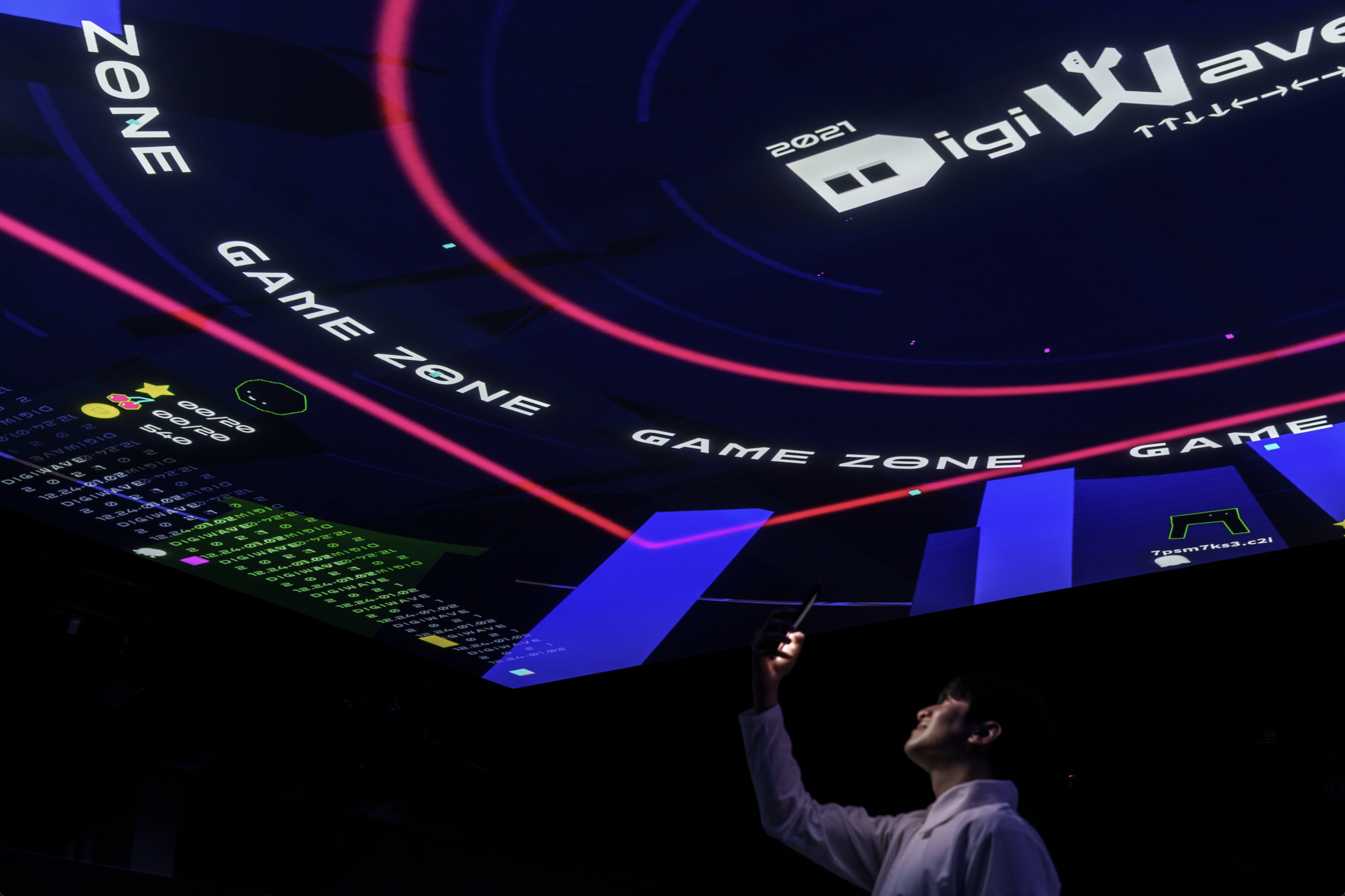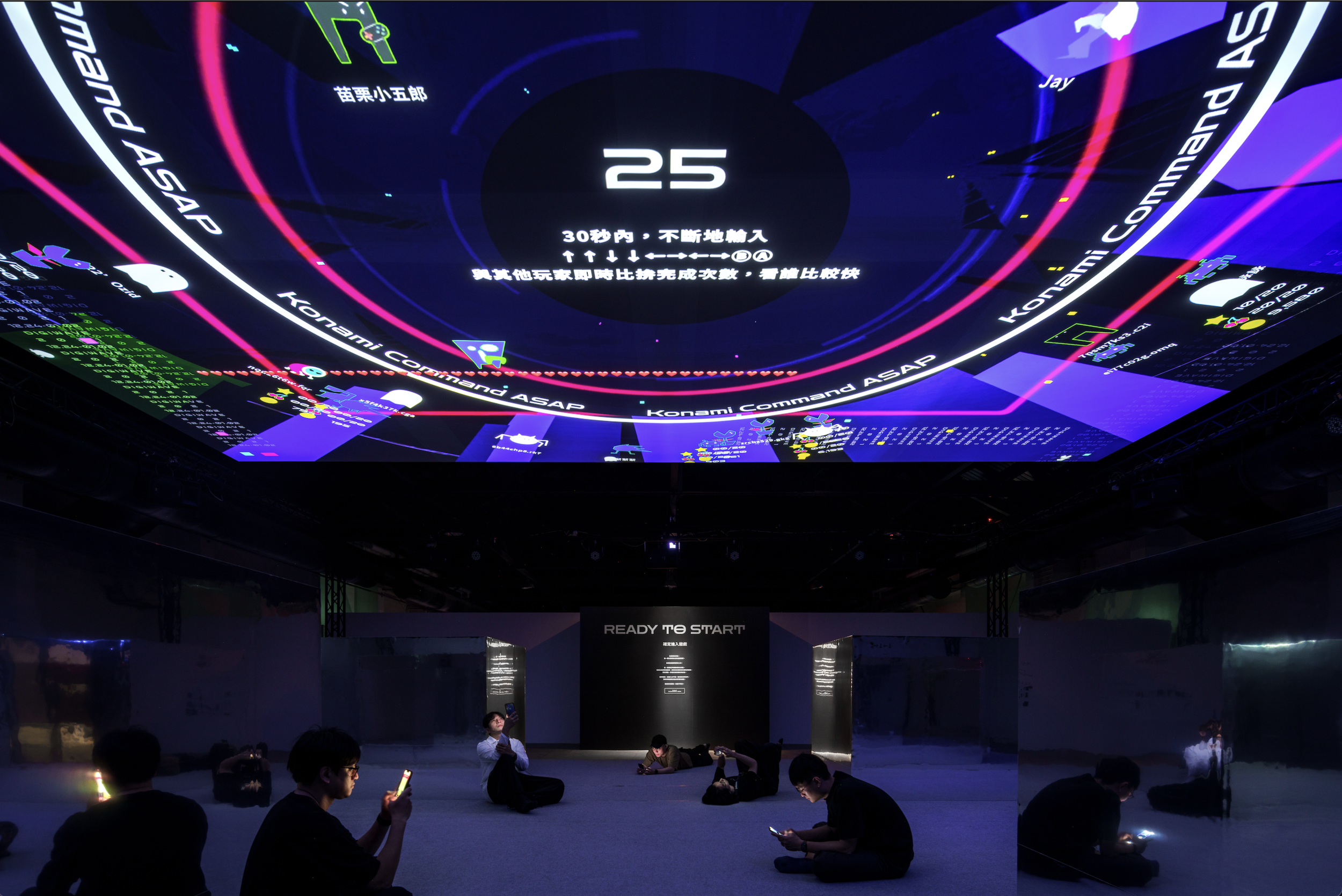 READY TO START 在加入官方LINE帳號後,藉由叁式團隊完整的系統及體驗設計,將天幕轉換為巨型遊戲畫面,讓觀者輕鬆加入互動,同時也在共創作品(提供=2021 DigiWave、叁式、攝影=Yi-Hsien Lee)