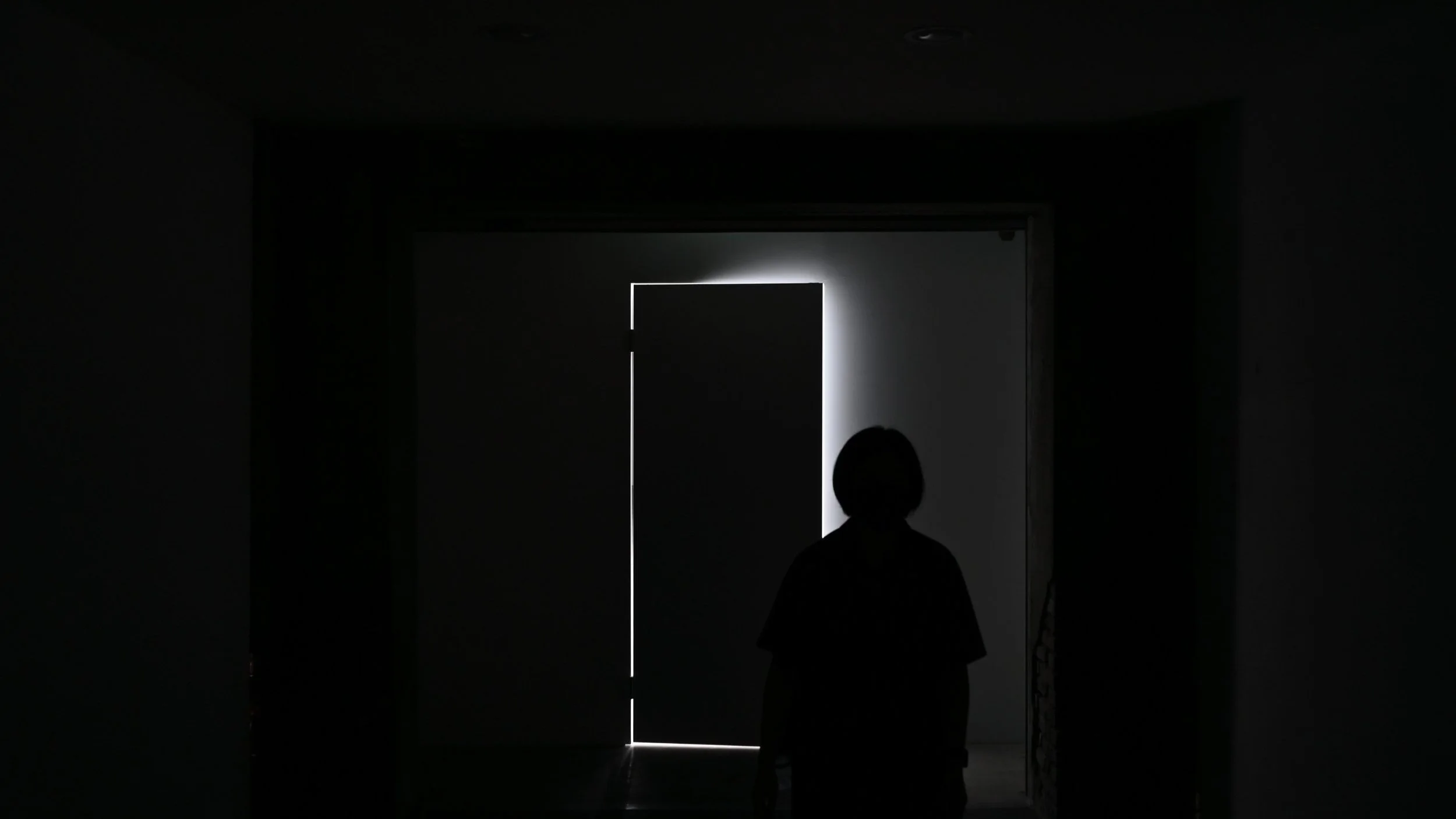 LOADING 進入主投影作品GAME ON前的讀取(LOADING)過程,空間策略上藉由極為白淨的廊道,作為前後展區的過渡空間,運用高反差的光感進行觀展氛圍轉場