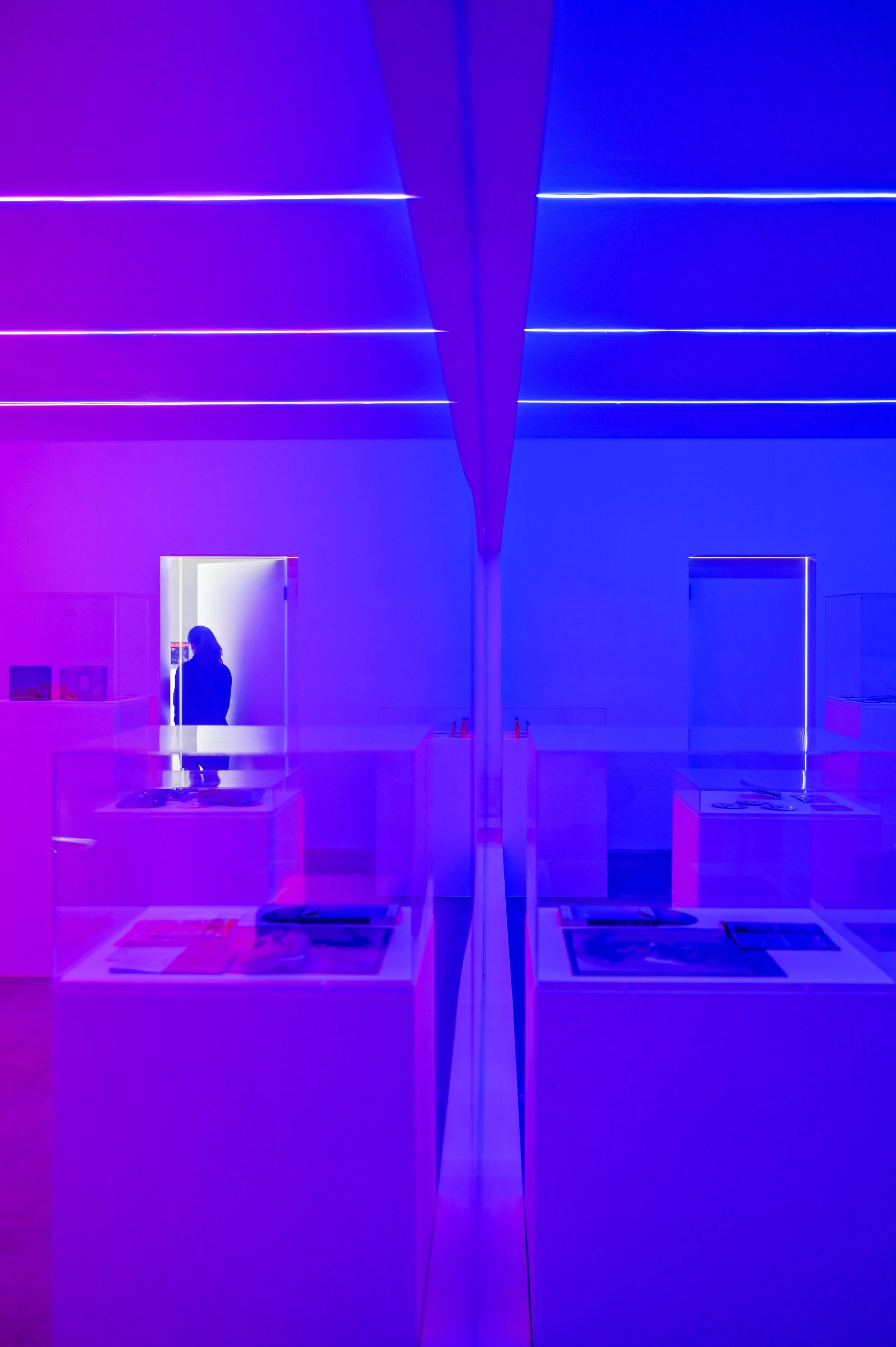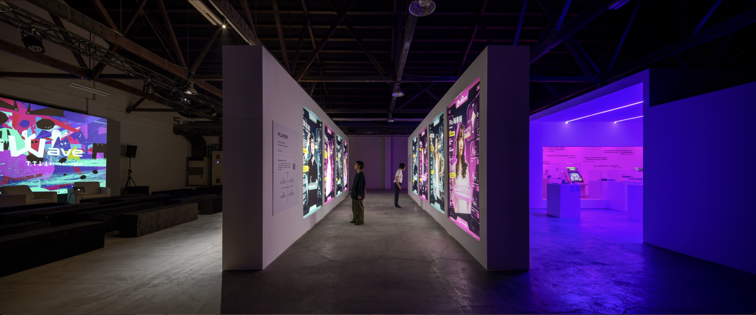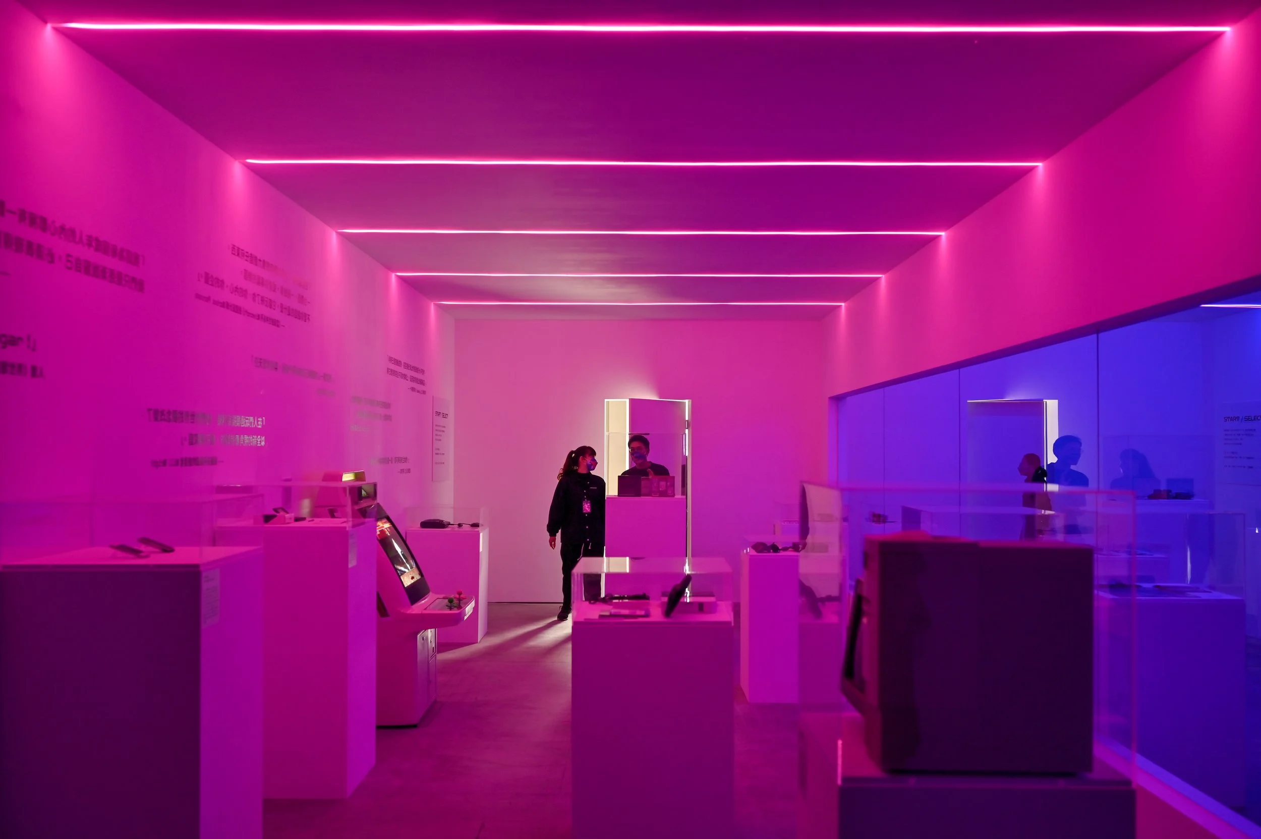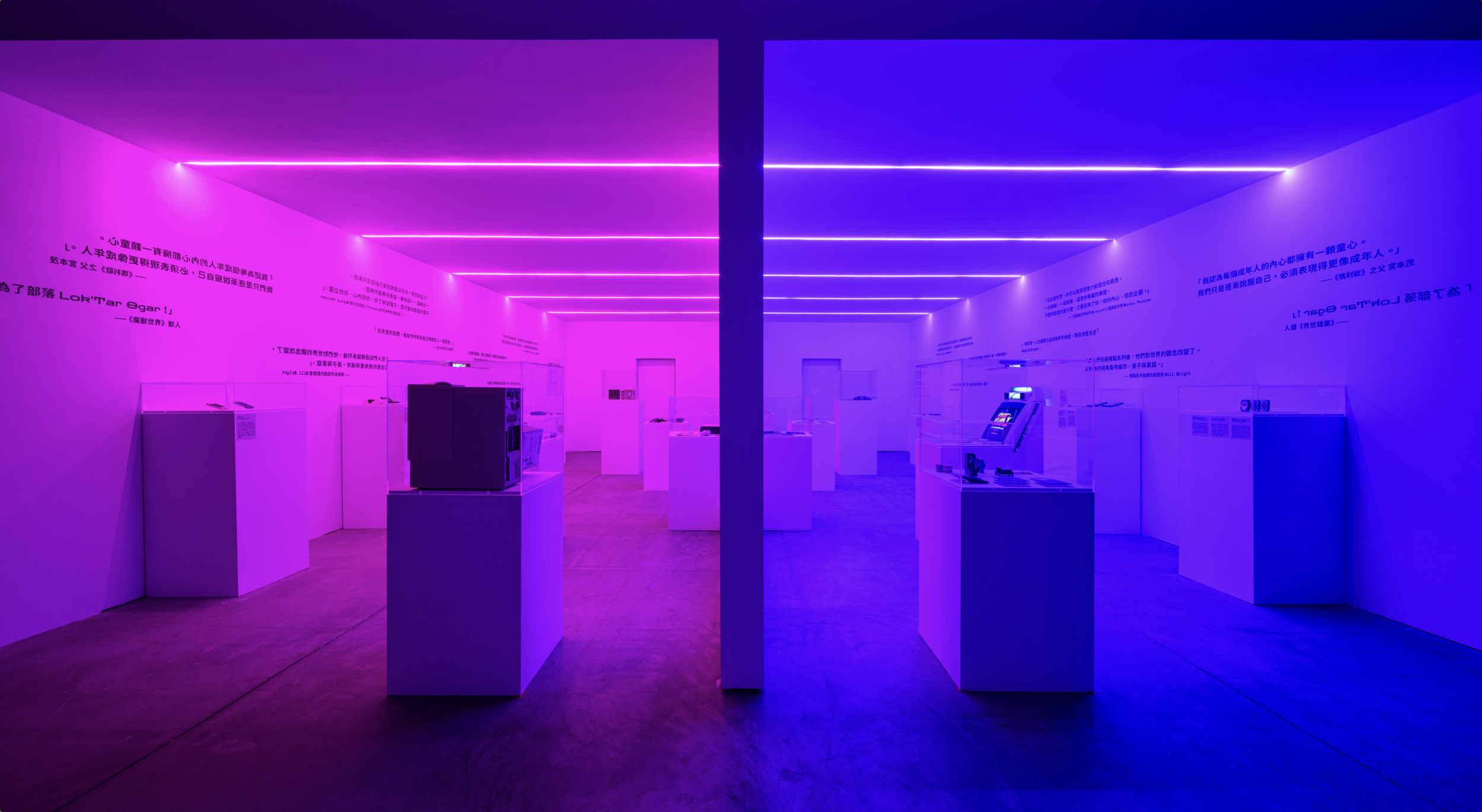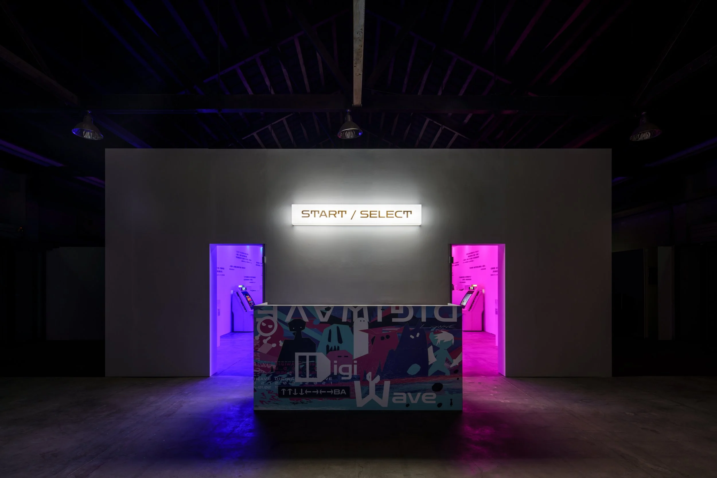 從登入(LOG IN)遊戲前總會有的起始畫面(PRESS START)作為起頭,由「START / SELECT」展區開始踏入真實、虛擬交錯的旅程,將主視覺所定調出的標準色轉譯為燈光,並結合電玩或電影中虛實、時間題材中常見的紅藍(如駭客任務中的紅藍藥丸、天能中的順行與逆行等),螢光藍作為虛擬的入口,開門後可見依照時間軸線展出二十世紀末以來的多款經典電玩遊戲,螢光粉作為真實的入口,可見遊戲載體、機台,策略上讓兩邊配置相互對稱且內容對應,中介運用玻璃材料本身既有的反射特性創造些微錯視感,小至說明牌的位置,大至展台方向性及牆面引言特別設定的正反字等,山陽山陰皆將其對稱性也應用至視覺策略中。