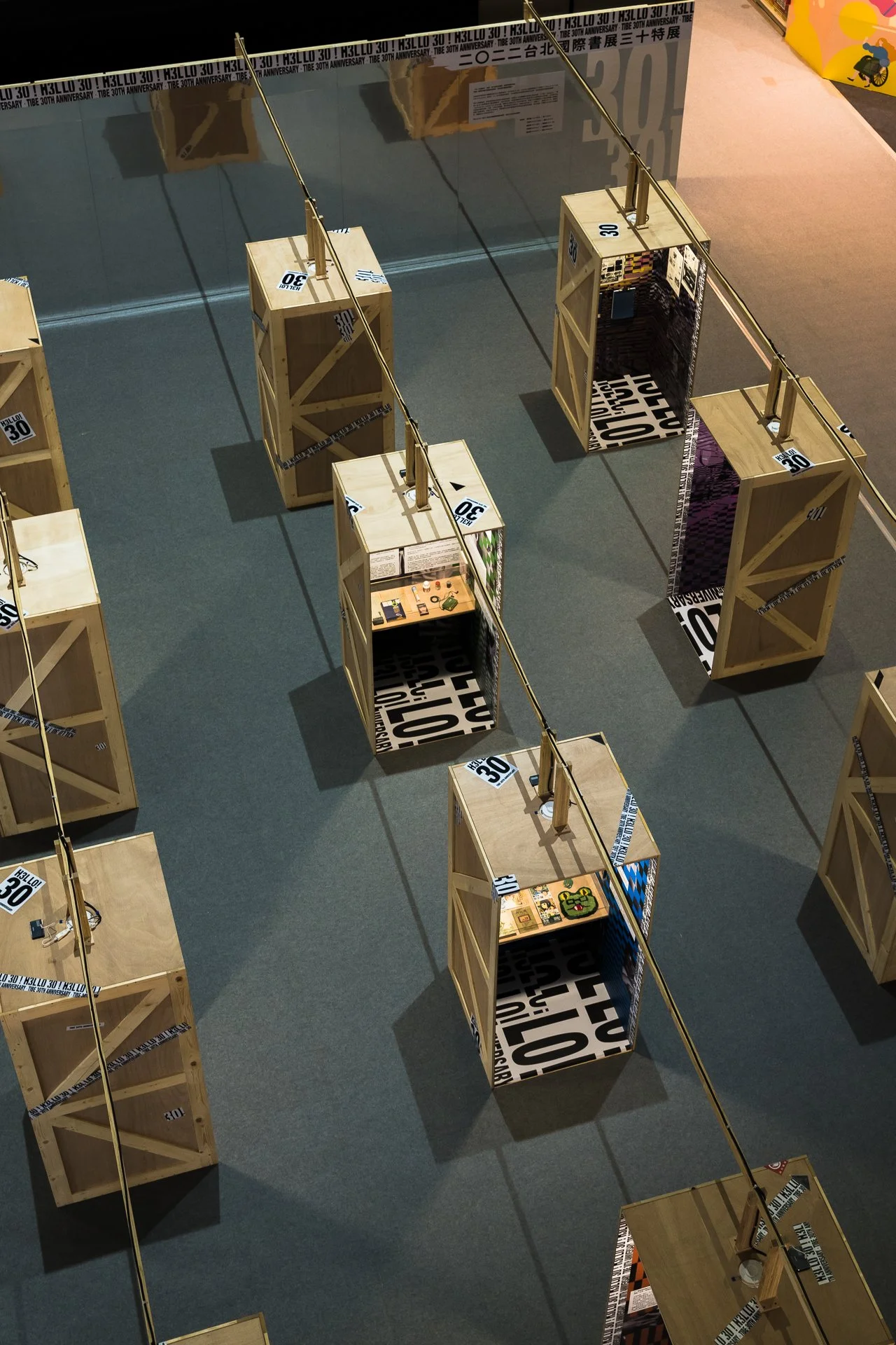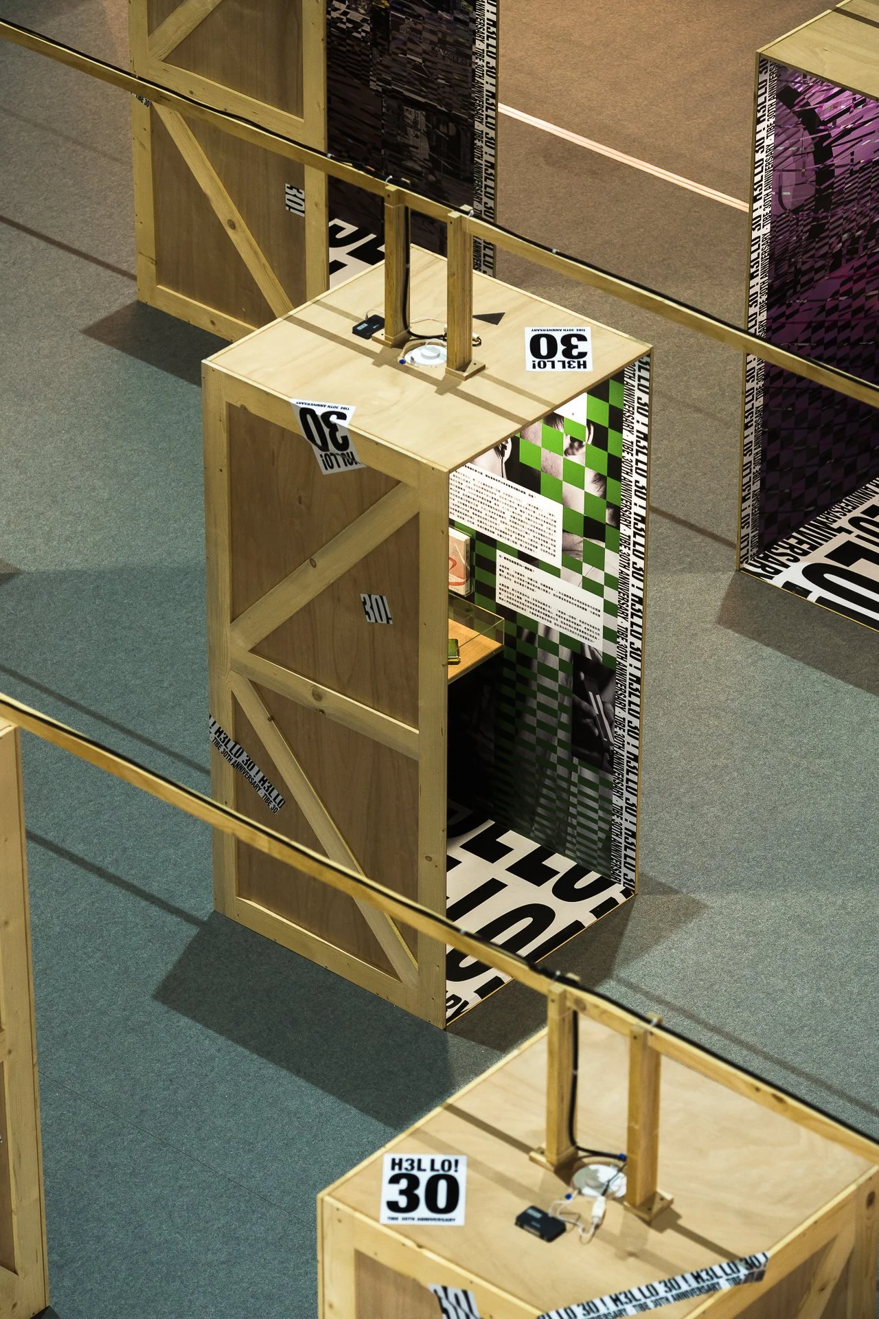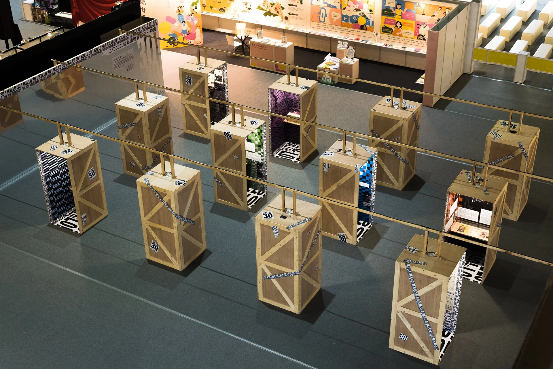 策展重點在於目的,以及要傳遞出什麼樣的宣言與訊息。面對數量眾多的主題與攤位,不再過度命名或提出新的名詞,回歸單純以HELLO! 30一聲招呼與問候作為展名,直接圍繞著書展的三十與年歲的三十,開展出內容。然而,數字也可以賦予其意義與個性,周年展大多在視覺優先著墨於數字的識別,山陽山陰更著重於視覺的延伸性,以及與內容、空間高度整合後所構築出來的氛圍。在世貿展示攤位的規格模組中,定義出新的模組單元予以對話,跳脫常見的手作風格,以簡約俐落的設計感,凸顯於眾多攤位中,並運用鏡面創造新的觀看視角,回應周而復始的無限延伸,以模組化膠囊單元中同中求異,在外在具有整體感的狀態下,創造進到小空間之中的反差與驚喜,展間內部藉由系統化的視覺延伸設定創造高度包覆感,藉由內容、視覺、空間等整合式策略來回應並傳遞出書展的多元、彈性與活力。