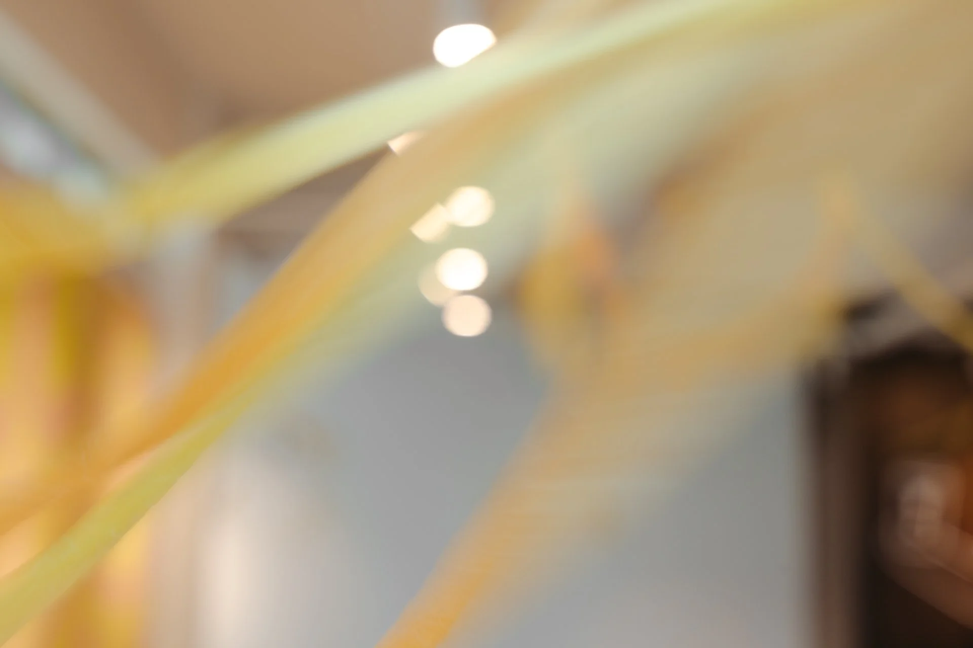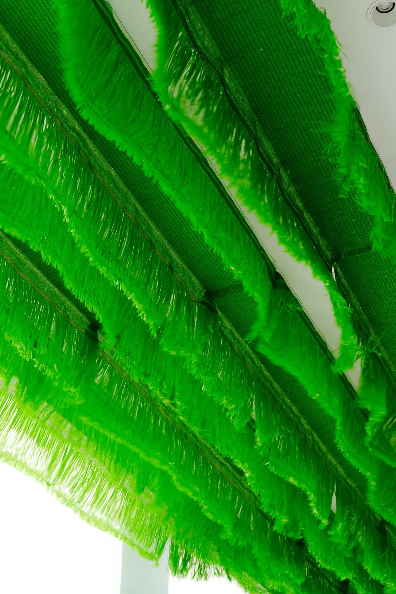 #直線流動 一樓可見一般在戶外泳池發揮遮陽降溫功能的流蘇遮陽網,隨風流動