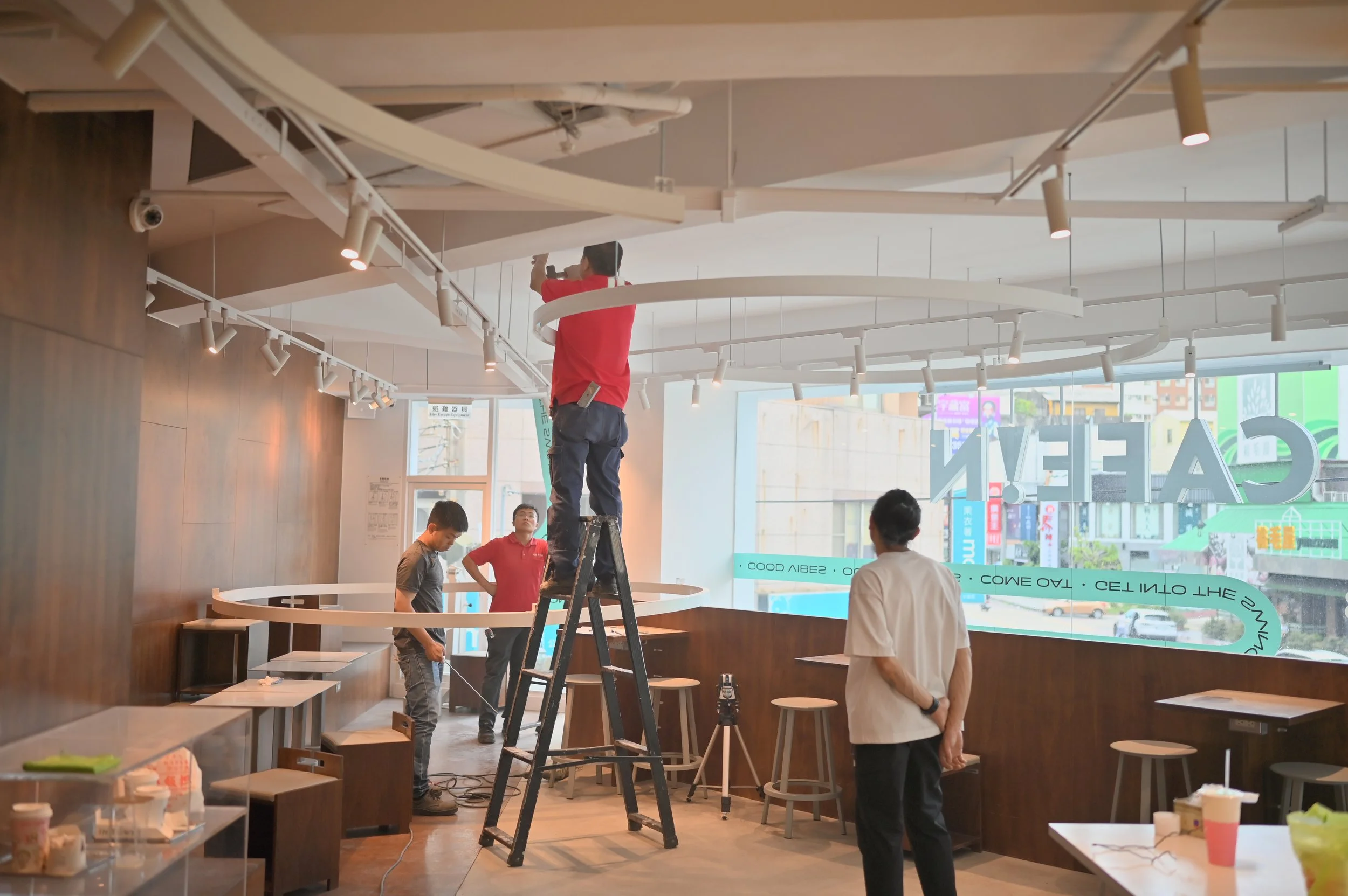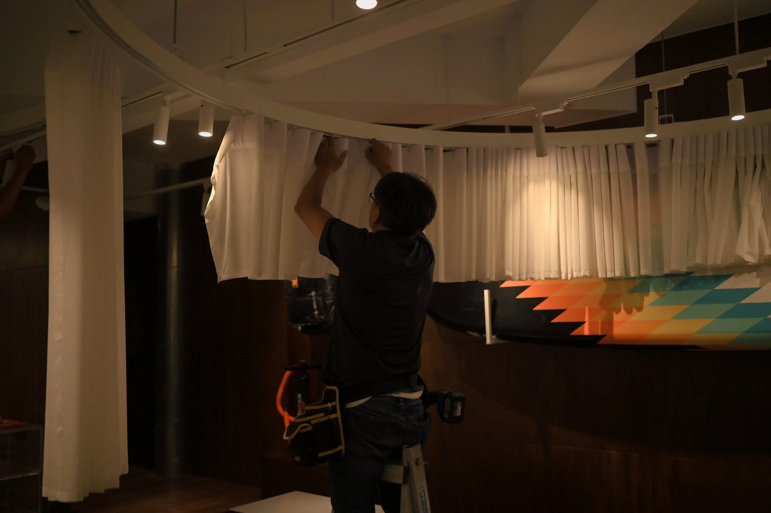 相較與上一檔,這次我們在提出「SWING」命題的當下,便已將延伸性考量其中,帶有擴大體驗的企圖,稍微在短暫快速的聯名行銷活動中過渡了一些展覽手法,思考著「現場性」的必要,哪些是影像不一定能再現的感受,以及如何讓消費者在既有的咖啡場域經驗疊加新意,因此在視覺與味覺的基本盤上增加了觸覺的環節,其中一項實驗是觀察到二樓民眾的使用習慣,在相對開放的空間,時常有顧客略需個人獨處的私密空間,抑或是會議討論的隱私範圍,藉此我們將品牌製作服飾使用的回收保特紗設定成軟隔間虛界定,縫合進空間之中。比起刻意的展現,或許不經意的材質接觸是更溫柔的宣示;另一項實驗則是日常材料的挪移,創造出非日常的體驗,關於SWING大多常見的都是視覺畫面的波浪意象,接著便將其轉換在軟材質的波浪切割等形式去扣連,但實際上SWING是在外力作用引發動能所產生的規律地、週期性地橫縱向搖擺或偏盪運動,是一項綜合感受,因此在現地空間中,人的流動、風的引動等都能引發SWING,這是山陽山陰所想傳遞的。