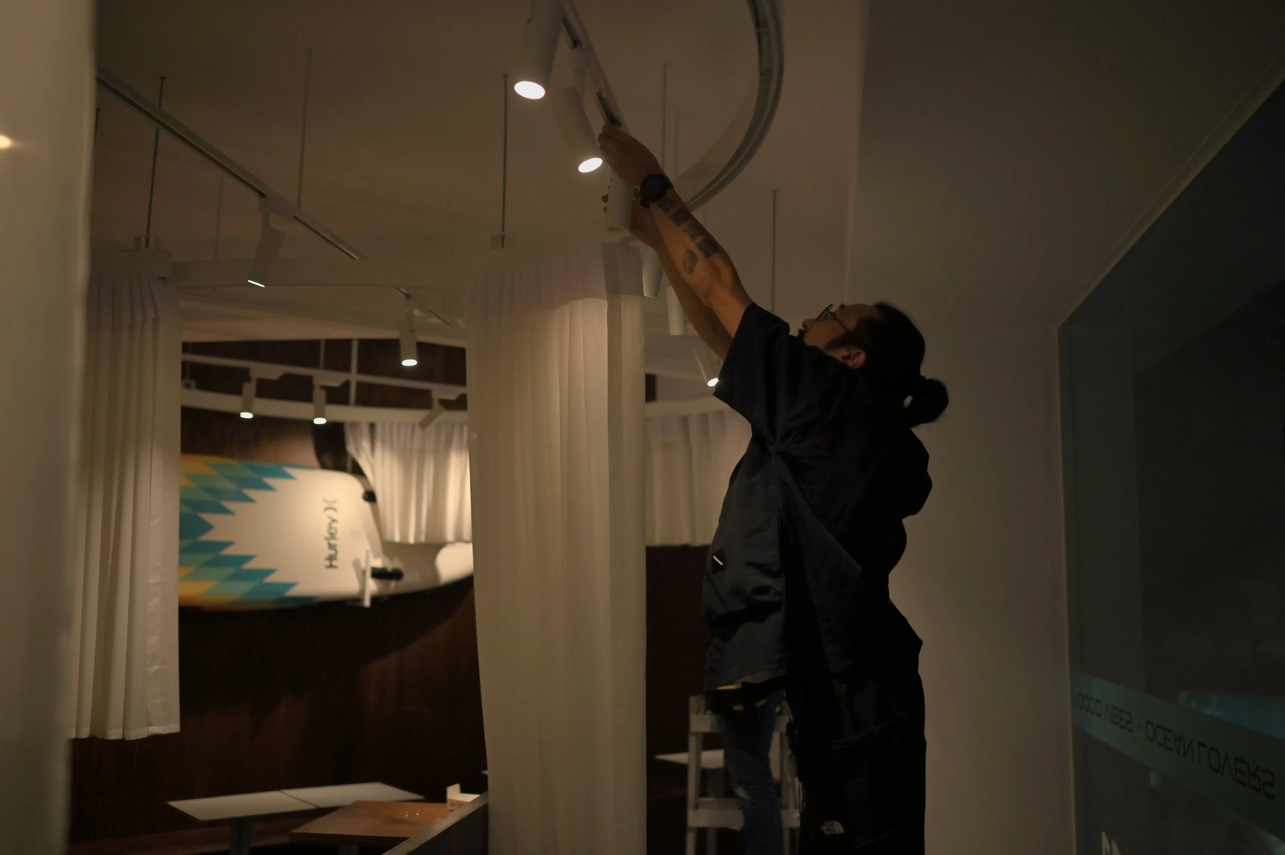 #橫向波動 二樓以專業衝浪品牌Hurley為主,呼應品牌精神使用回收P.E.T. 塑料瓶製造的紗布,萃取海浪意象,運用面狀布料將觀者包覆,除視覺感亦能觸碰到材料本身