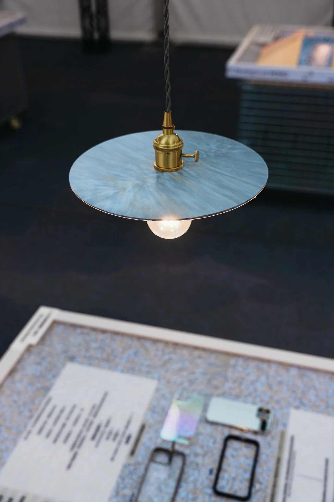 也進一步透過 SML 媒合與 ECOJOY 合作將其碎粒化為創作媒材,重新再造成現場參觀者可碰觸到的展桌及燈盤。